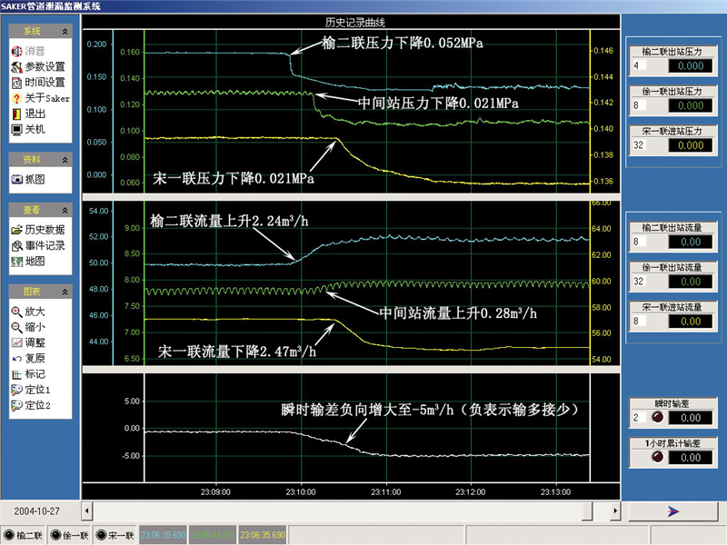 04年10月27日23時10分榆宋輸油管線發(fā)生泄漏,系統(tǒng)報警。根據(jù)各站流量、壓力的變化趨勢及輸差變化,可以判斷為典型的管線泄漏,系統(tǒng)及時報警,準(zhǔn)確定位。
