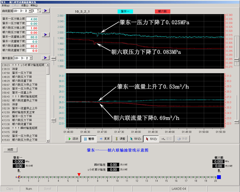 2010年3月2日1時44分46秒肇東一-朝六聯(lián)輸油管線發(fā)生泄漏,28秒后系統(tǒng)報(bào)警,泄漏瞬時排量為1.2m3/h,定位泄漏位置距肇東一聯(lián)13.3公里。管理部門處理及時,漏失原油全部繳回。
