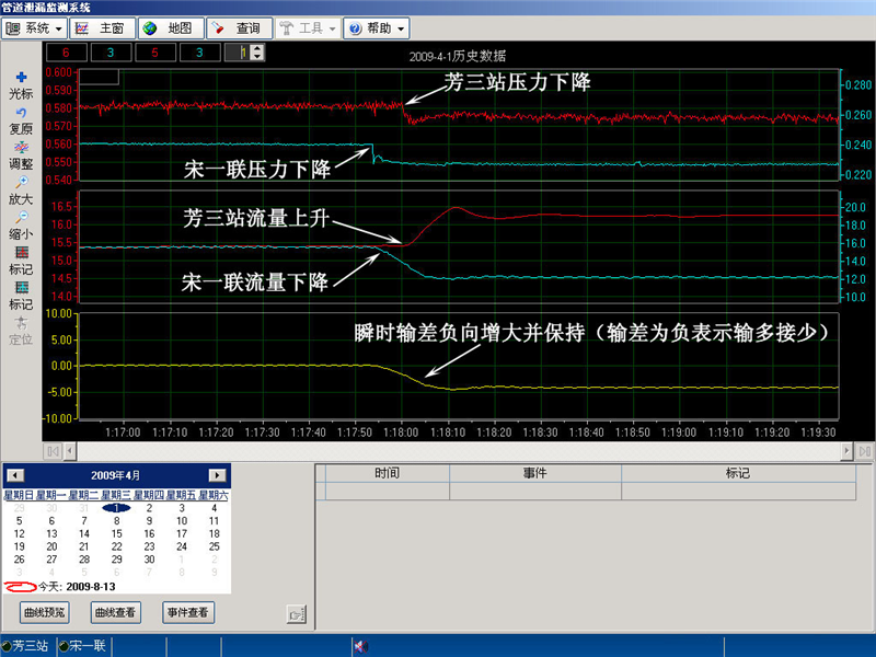 09年4月1日芳三站-宋一聯(lián)管線(xiàn)泄漏報(bào)警曲線(xiàn)圖
