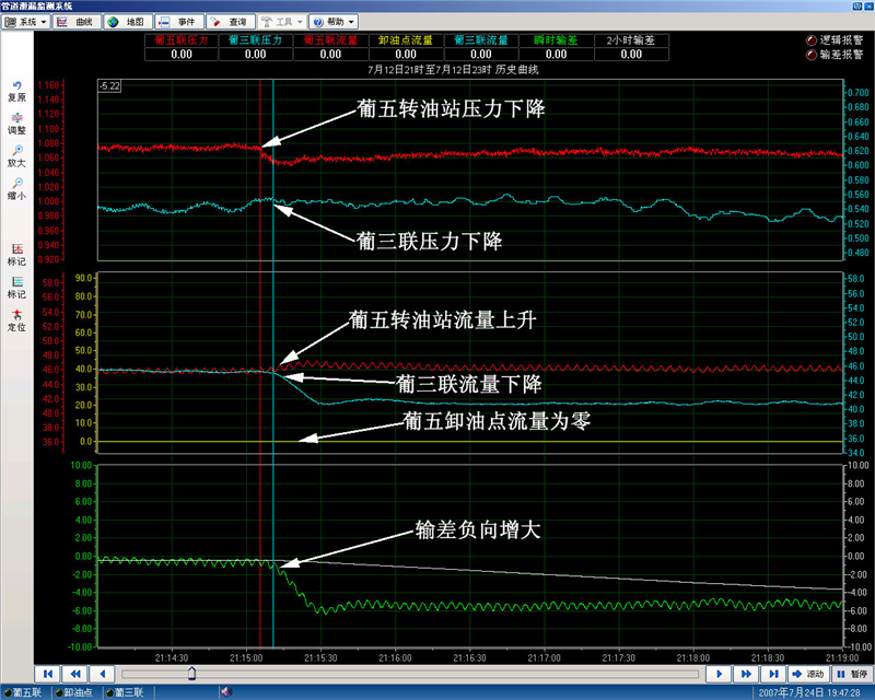 2007年7月12日葡五轉(zhuǎn)-葡三聯(lián)管線泄漏報(bào)警曲線圖