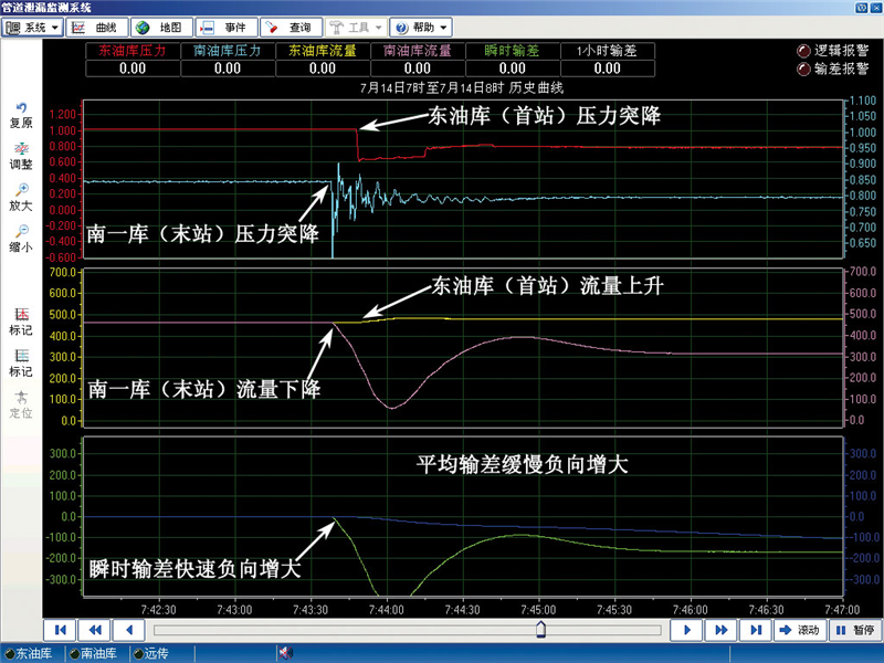 2007年7月14日東油庫(kù)-南一庫(kù)泄漏曲線圖