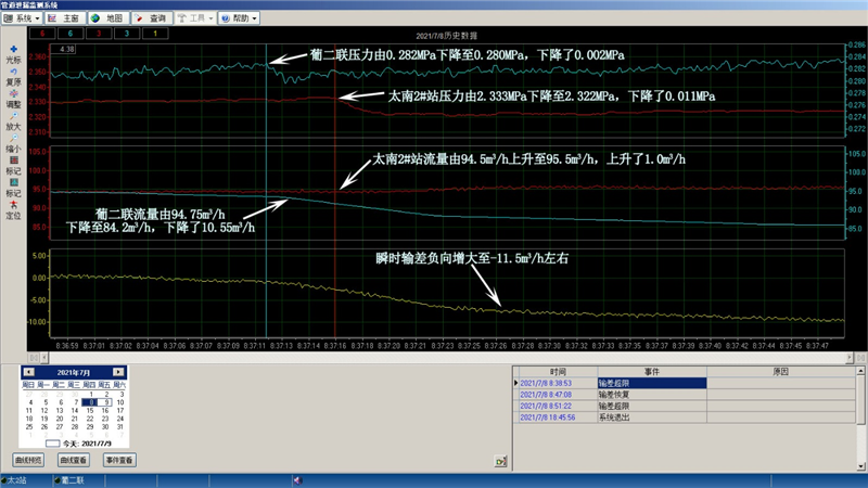 2021年7月8日8時(shí)37分12秒發(fā)生泄漏,38分53秒系統(tǒng)報(bào)警,定位在距太南2#站8.0公里處。泄漏發(fā)生時(shí)太南2#站壓力由2.333MPa下降至2.322MPa,下降了0.011MPa;流量由94.5m3/h上升至95.5m3/h,上升了1.0m3/h。葡二聯(lián)壓力由0.282MPa下降至0.280MPa,下降了0.002MPa;流量由94.75m3/h下降至84.2m3/h,下降了10.55m3/h;瞬時(shí)輸差下降至-11.5m3/h左右。