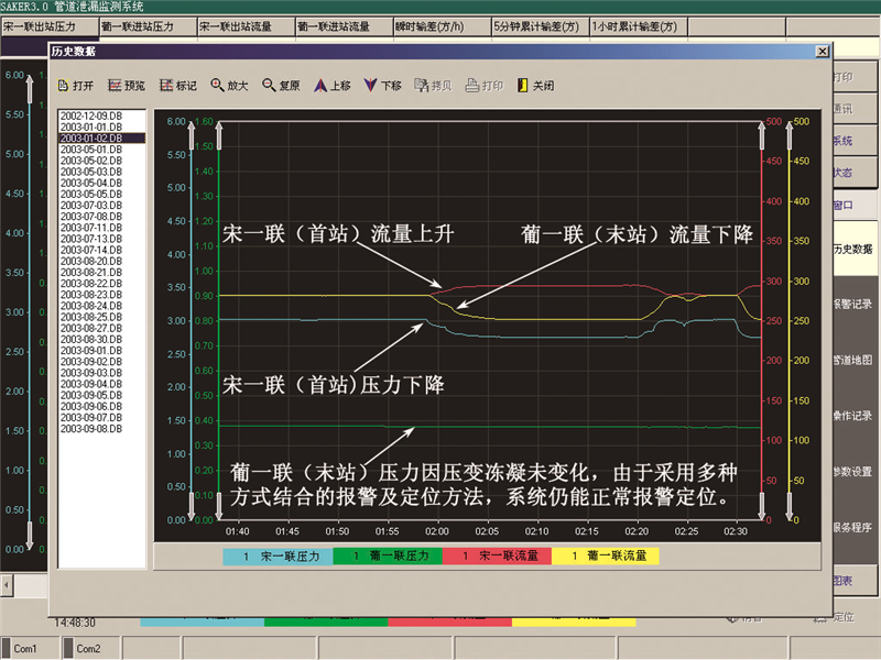 2003年1月2日1時(shí)59分宋葡線輸油管線發(fā)生泄漏,LD-SAKER系統(tǒng)監(jiān)測到該次泄漏,成功報(bào)警、準(zhǔn)確定位,定位泄漏位置在距宋一聯(lián)13.30公里處。
