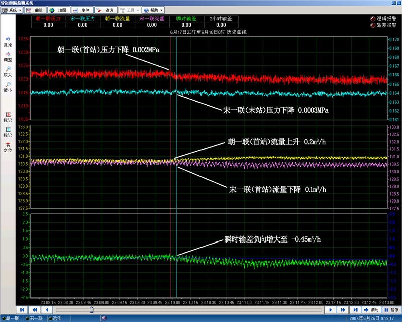 朝一聯(lián)-宋一聯(lián)輸油管線長54㎞,管徑ф273㎜,日輸原油3200m3。 2006年12月安裝LD-SAKER管道泄漏監(jiān)測系統(tǒng)。2007年6月17日23時09分58秒管線發(fā)生泄漏:朝一聯(lián)壓力從1.822MPa下降到1.820MPa下降幅度0.002MPa;宋一聯(lián)壓力從0.1643MPa下降到0.164MPa下降幅度0.0003MPa;朝一聯(lián)流量從130.7m3/h上升到130.9m3/h上升幅度0.2m3/h;宋一聯(lián)流量從130.65m3/h下降到130.55m3/h下降幅度0.1m3/h;輸差約為 -0.45 m3/h(因流量計量設備精度原有輸差 -0.1 m3/h左右,實際兩站輸差較先前變化應為-0.3 m3/h),系統(tǒng)定位泄漏點在距朝一聯(lián)21.67公里處。該次為管線腐蝕穿孔。